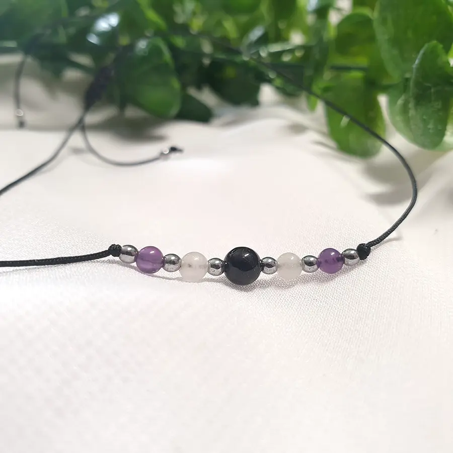 Minimalistyczna bransoletka z kamieni naturalnych została wykonana na wytrzymałym sznurku jubilerskim (na zdjęciu w kolorze czarnym). Jej główną ozdobą jest koralik czarnego turmalinu w towarzystwie ametystu i kwarcu różowego, wykończona jest zaś drobnymi koralikami hematytu w kolorze srebrnym.