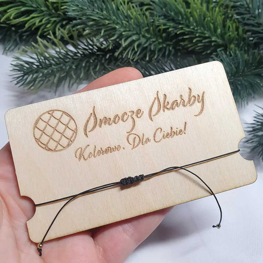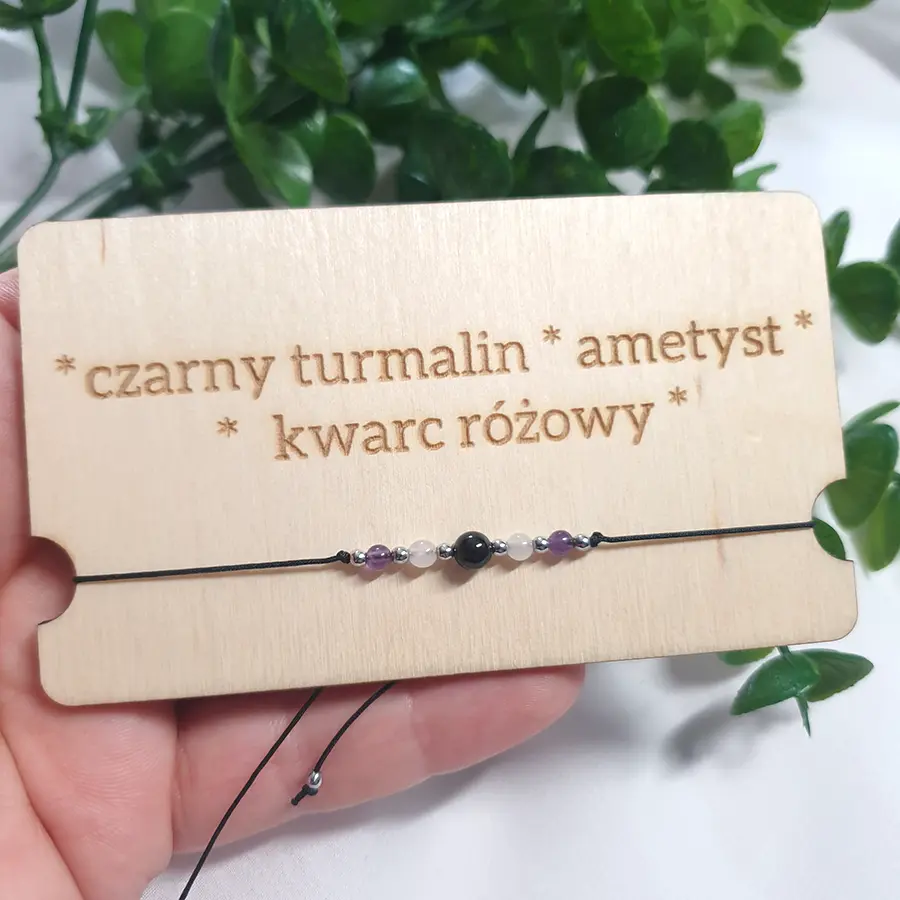 Bransoletka wysyłana jest na ozdobnym, grawerowanym drewienku z listą wykorzystanych kamieni, co czyni ją idealną na prezent.