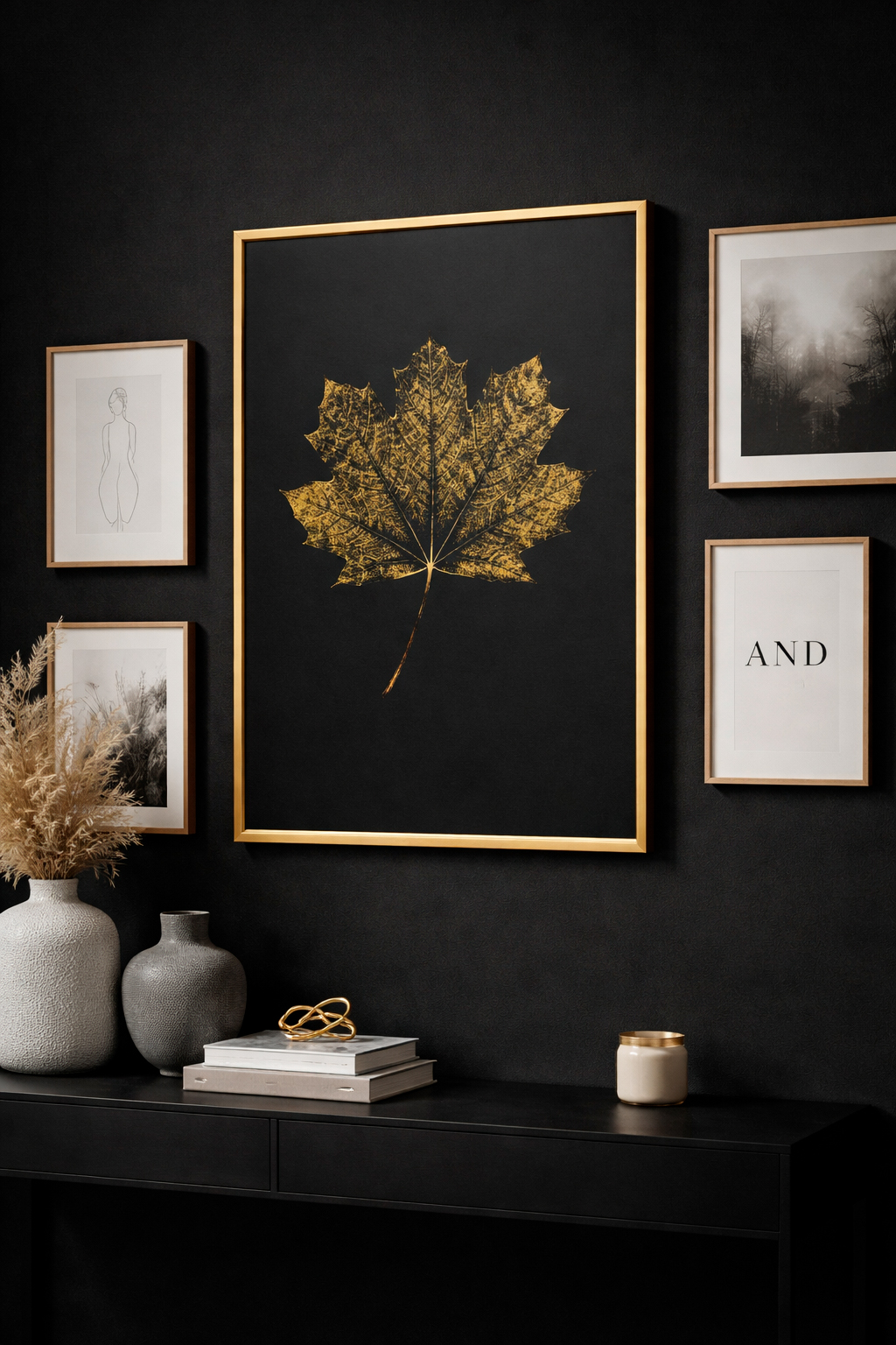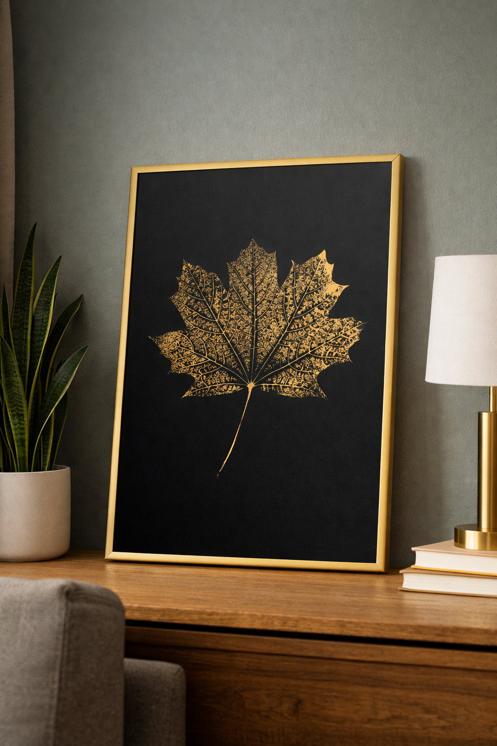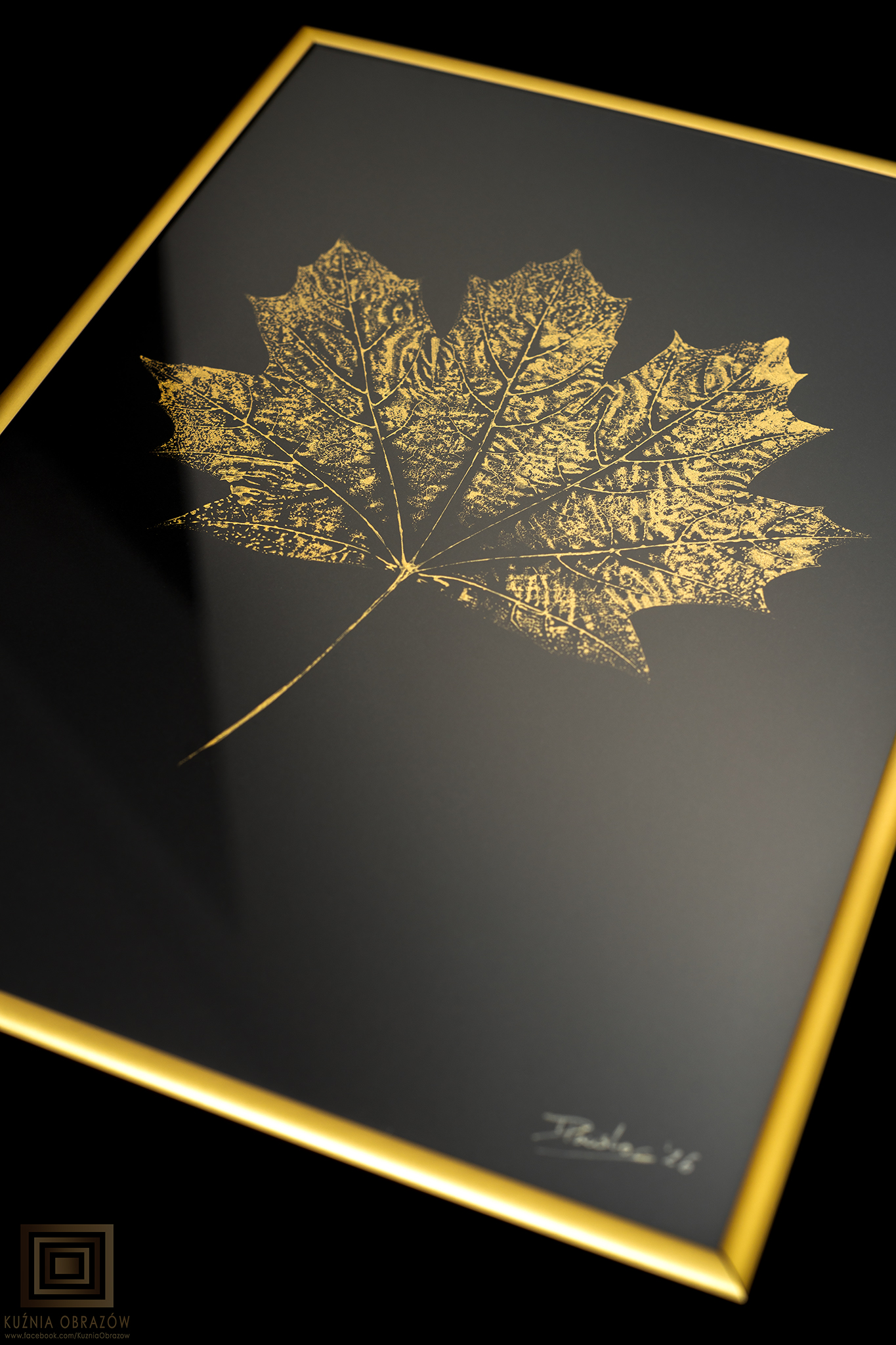 Plakat przedstawia artystyczną monotypię liścia klonu w złotej tonacji, co nadaje mu luksusowy i ponadczasowy charakter.