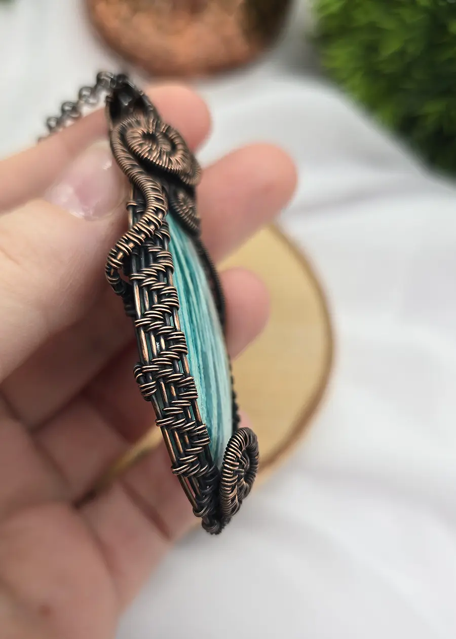 Ten miedziany wisior z amazonitem powstał w sposób spontaniczny i właśnie ta naturalność nadaje mu wyjątkowego uroku. W centrum kompozycji znajduje się pasiasty amazonit, zachwycający łagodnymi przejściami między odcieniami zieleni i błękitu, przełamanymi subtelnymi, jasnymi refleksami. Kolorystyka kamienia przywodzi na myśl spokojną taflę wody i kontakt z naturą, wprowadzając do całości atmosferę wyciszenia i harmonii.