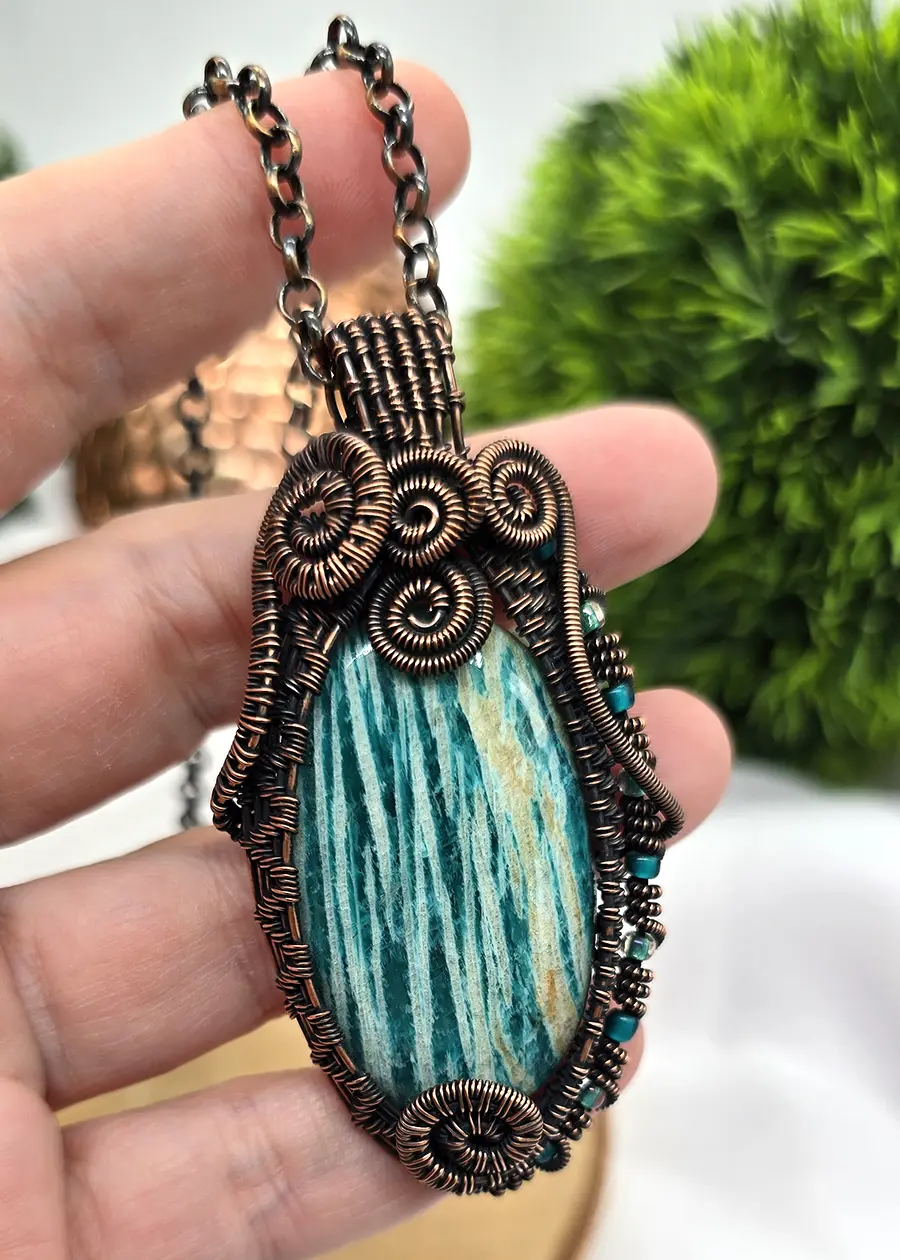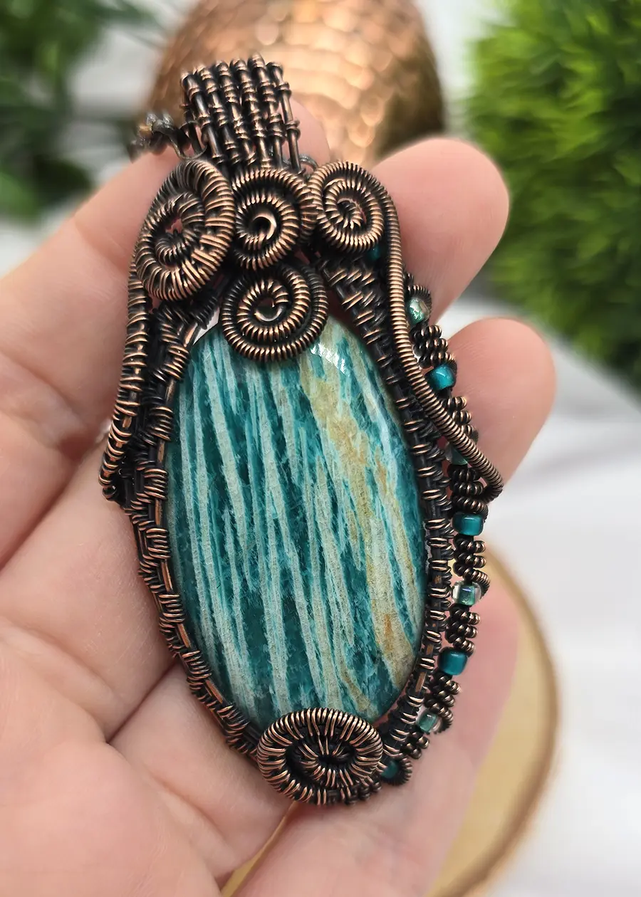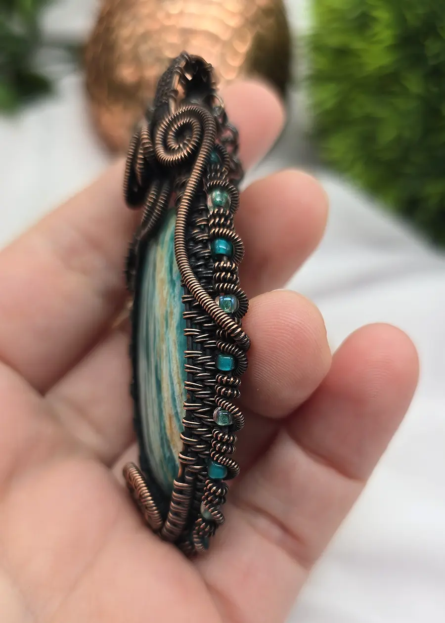 Kamień został oprawiony w ręcznie kształtowaną miedź, tworząc dekoracyjną formę pełną miękkich linii i spiralnych detali. Drobne koraliki szklane TOHO dopełniają projekt, podkreślając barwy amazonitu i dodając mu głębi oraz lekkości.