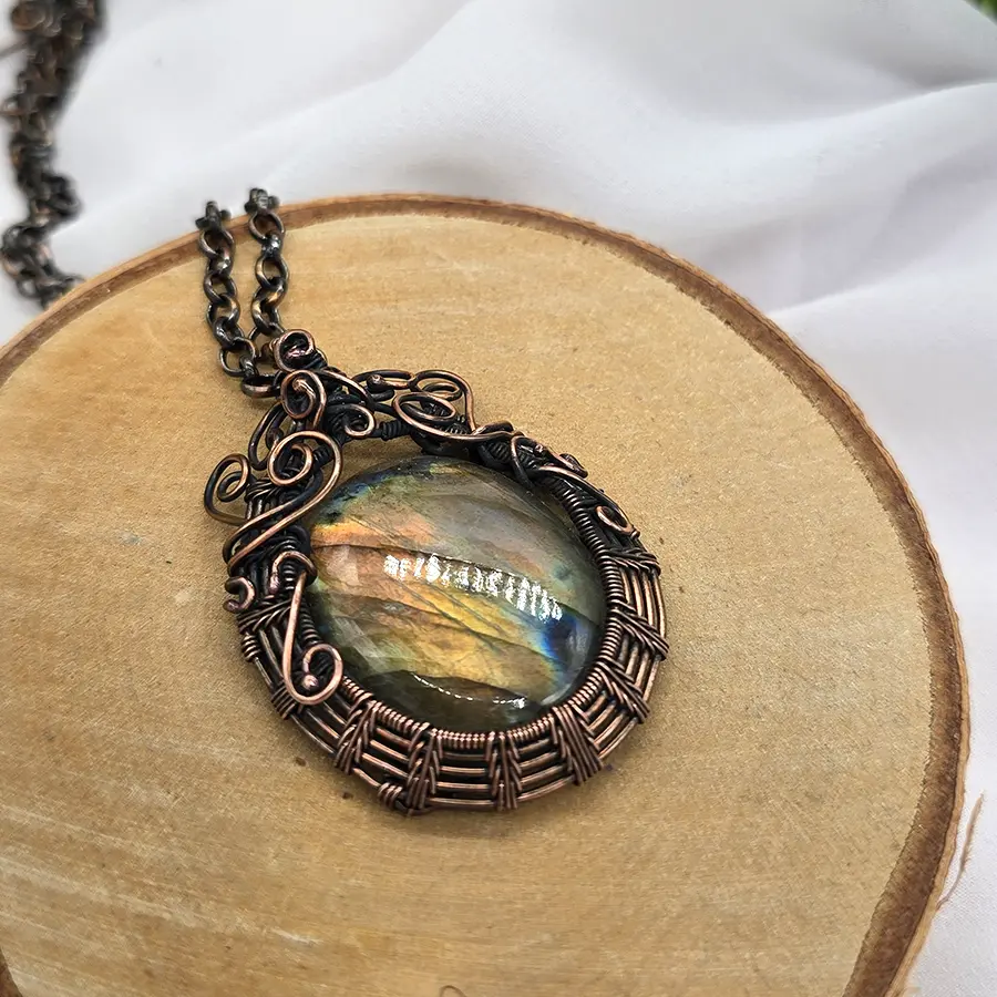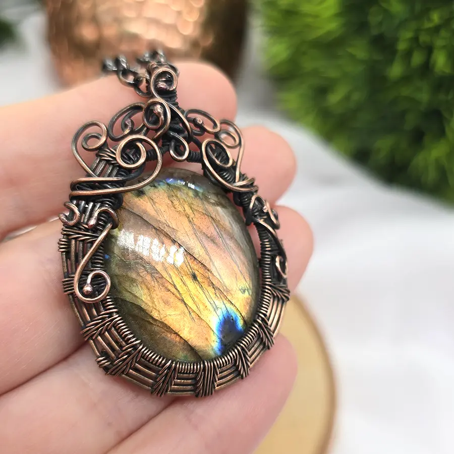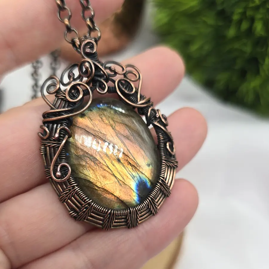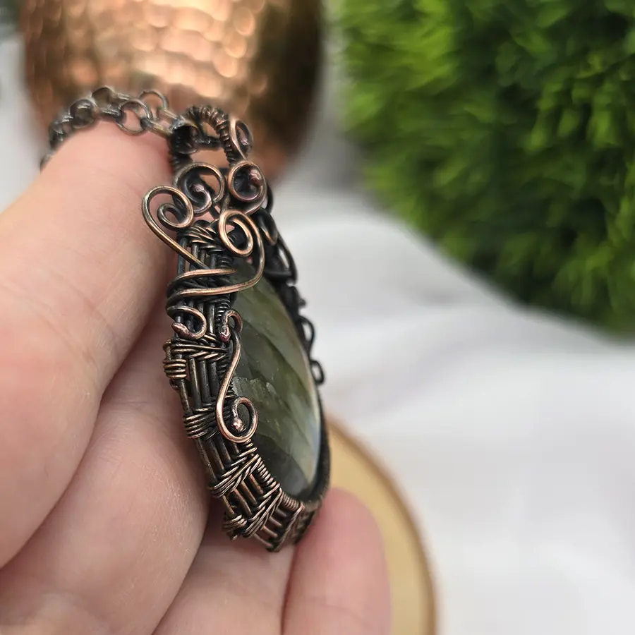 Centralny kamień został oprawiony w ręcznie kształtowaną miedź, tworząc harmonijną formę pełną miękkich, płynnych linii i dekoracyjnych detali. Wisior powstał w technice wire weaving, czyli poprzez precyzyjne splatanie drutów o różnej grubości. To metoda wymagająca dużej dokładności, dzięki której każdy projekt jest niepowtarzalny.