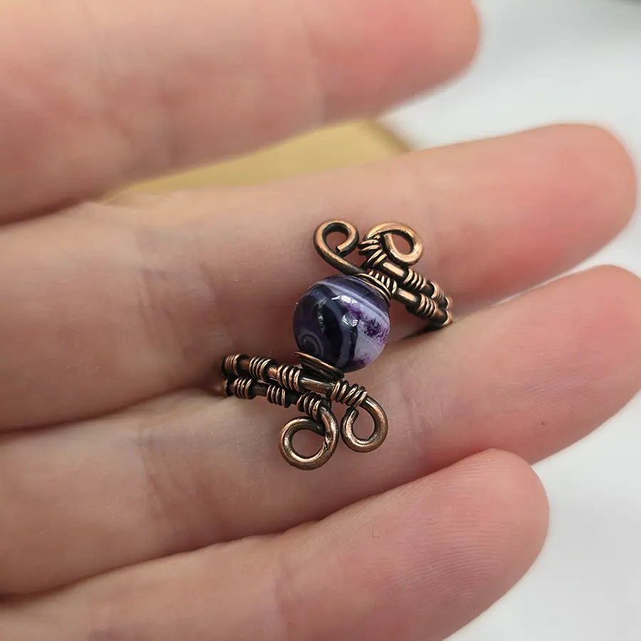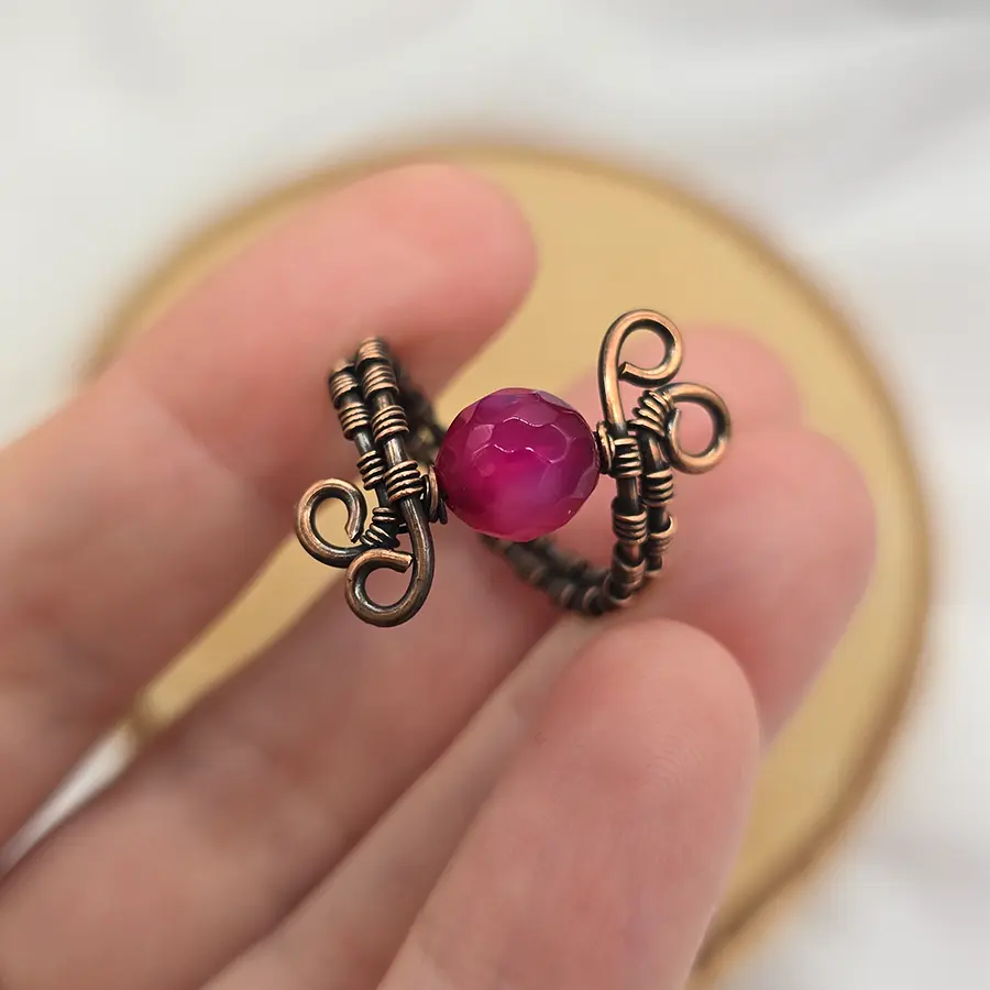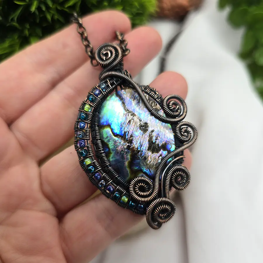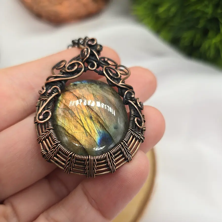 Centralny kamień został oprawiony w ręcznie kształtowaną miedź, tworząc harmonijną formę pełną miękkich, płynnych linii i dekoracyjnych detali. Wisior powstał w technice wire weaving, czyli poprzez precyzyjne splatanie drutów o różnej grubości. To metoda wymagająca dużej dokładności, dzięki której każdy projekt jest niepowtarzalny.