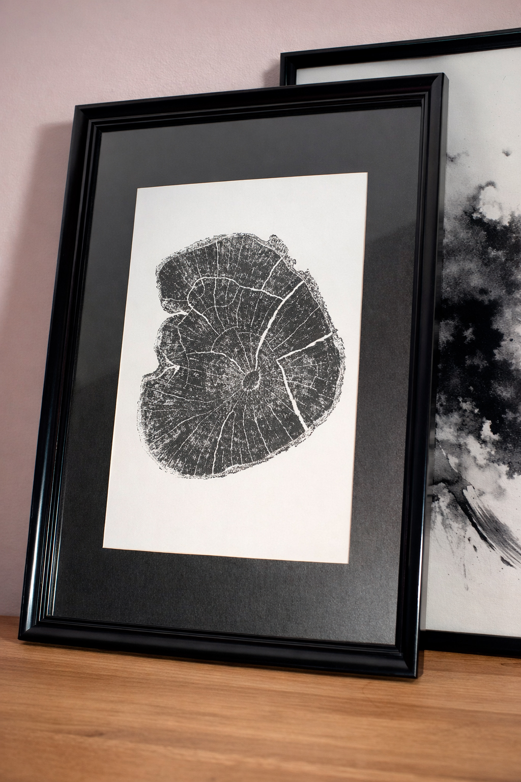 Ta wyjątkowa praca graficzna powstała z bezpośredniego odbicia przekroju drewna śliwy na papierze artystycznym. Każdy detal to ślad naturalnej struktury drzewa – niepowtarzalny i jedyny w swoim rodzaju.