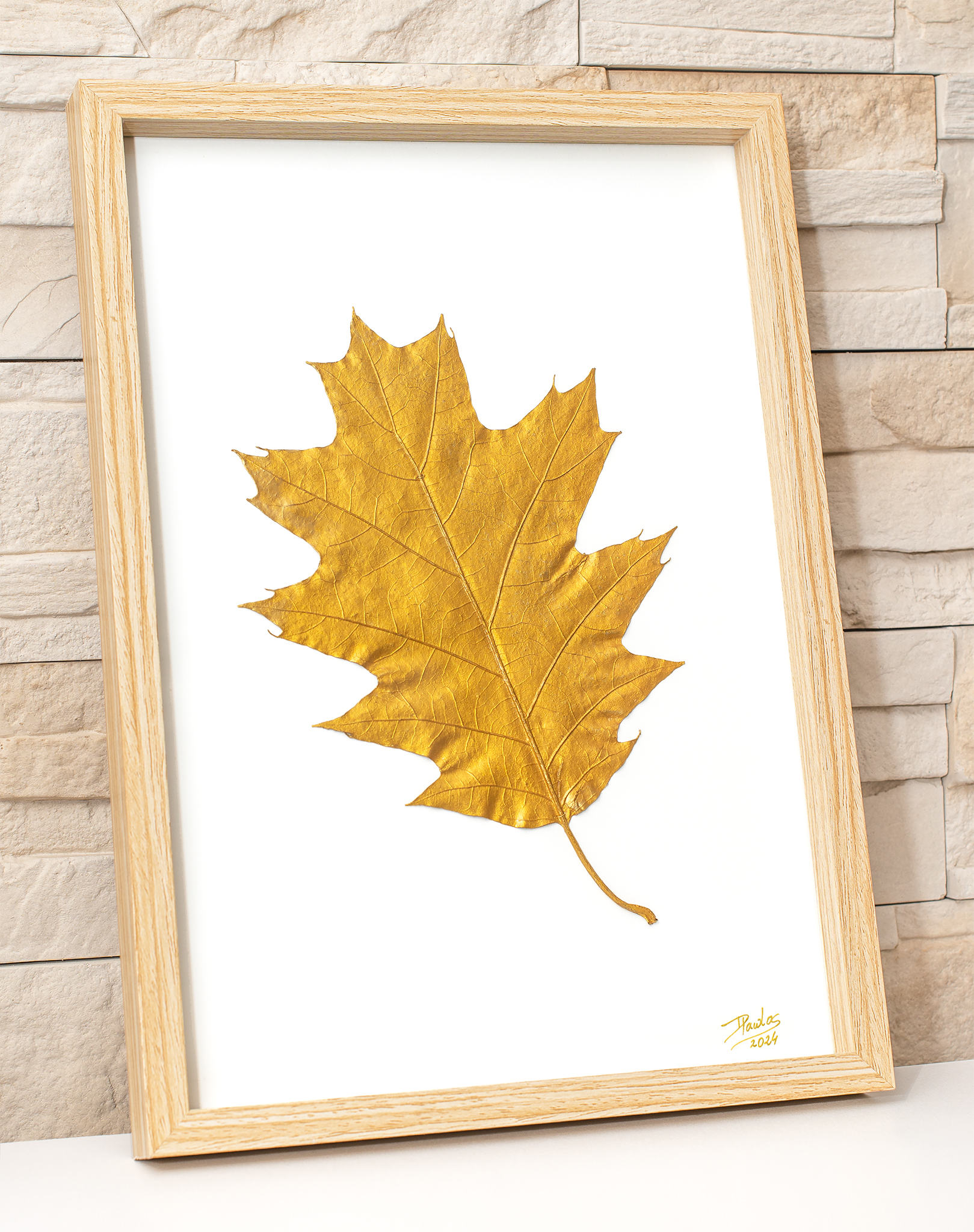 Obraz przedstawiający ręcznie malowany złoty liść dębu w drewnianej ramce w stylu boho.