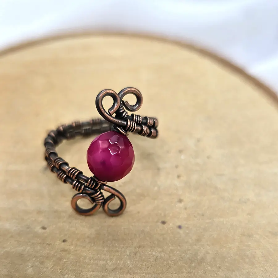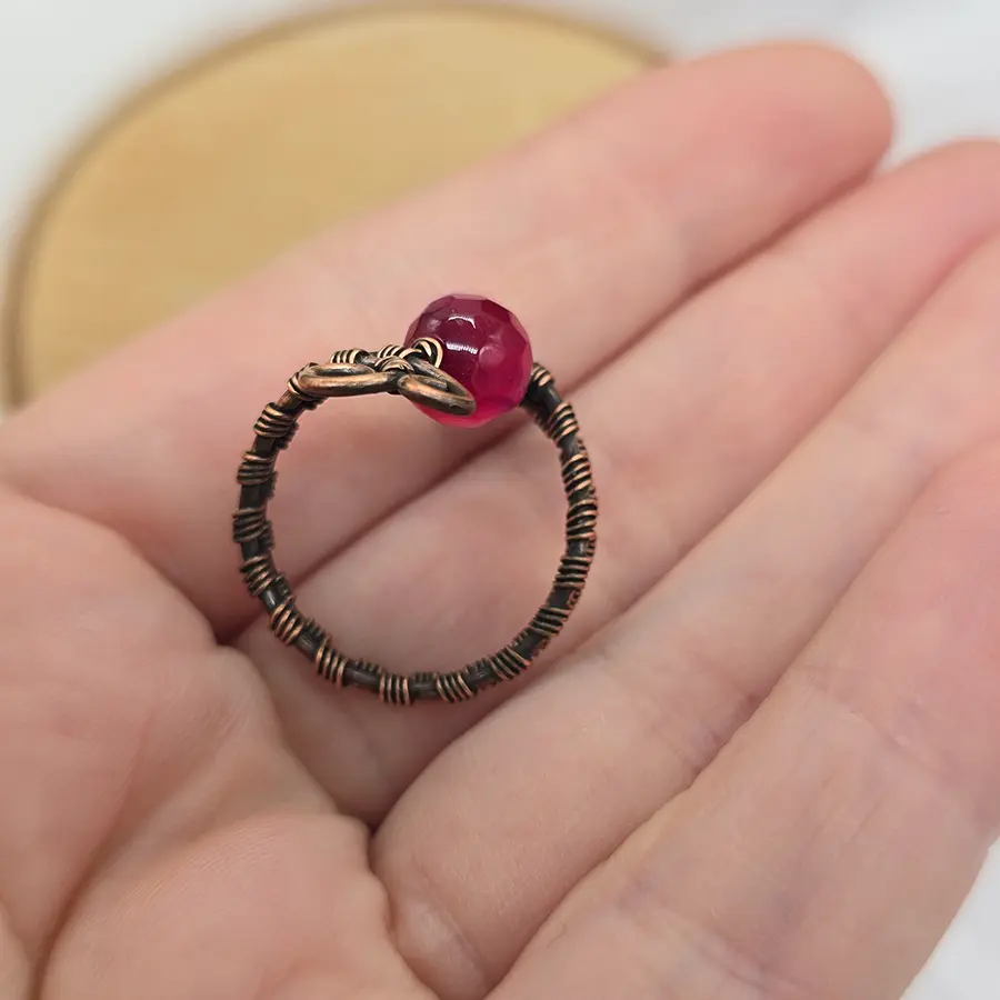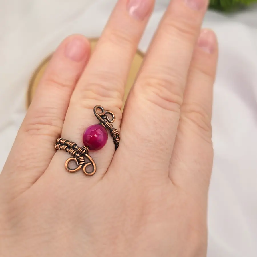 Ten miedziany pierścionek z agatem to drobny detal, który potrafi przyciągnąć uwagę. W jego centrum znajduje się delikatnie fasetowany koralik w intensywnym, żywym odcieniu różu. Kamień pięknie łapie światło, dodając całości lekkości i wyrazistości.