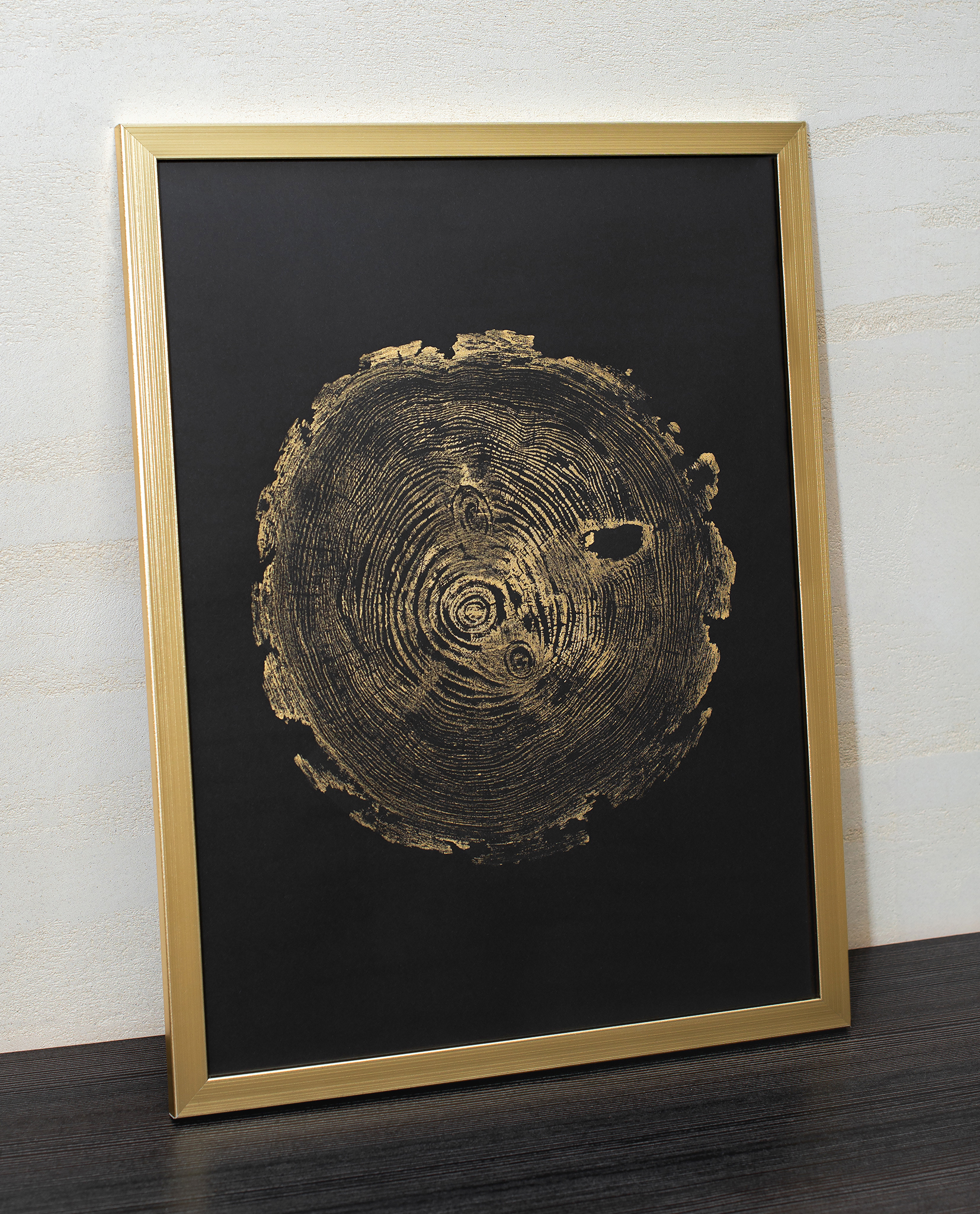 Ta wyjątkowa praca graficzna powstała z bezpośredniego odbicia plastra sosny na papierze artystycznym.