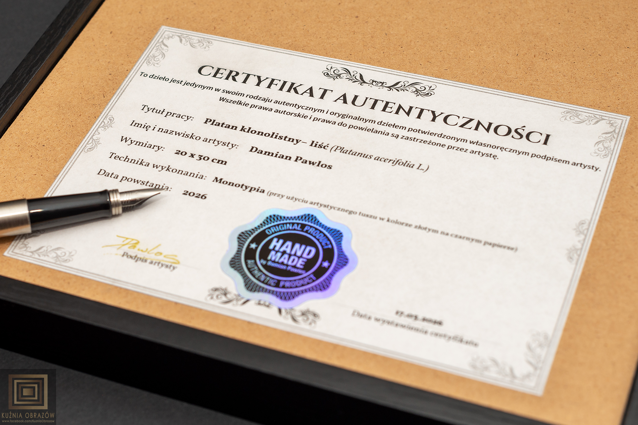Złoty liść platana klonolistnego – autorska grafika rękodzielnicza