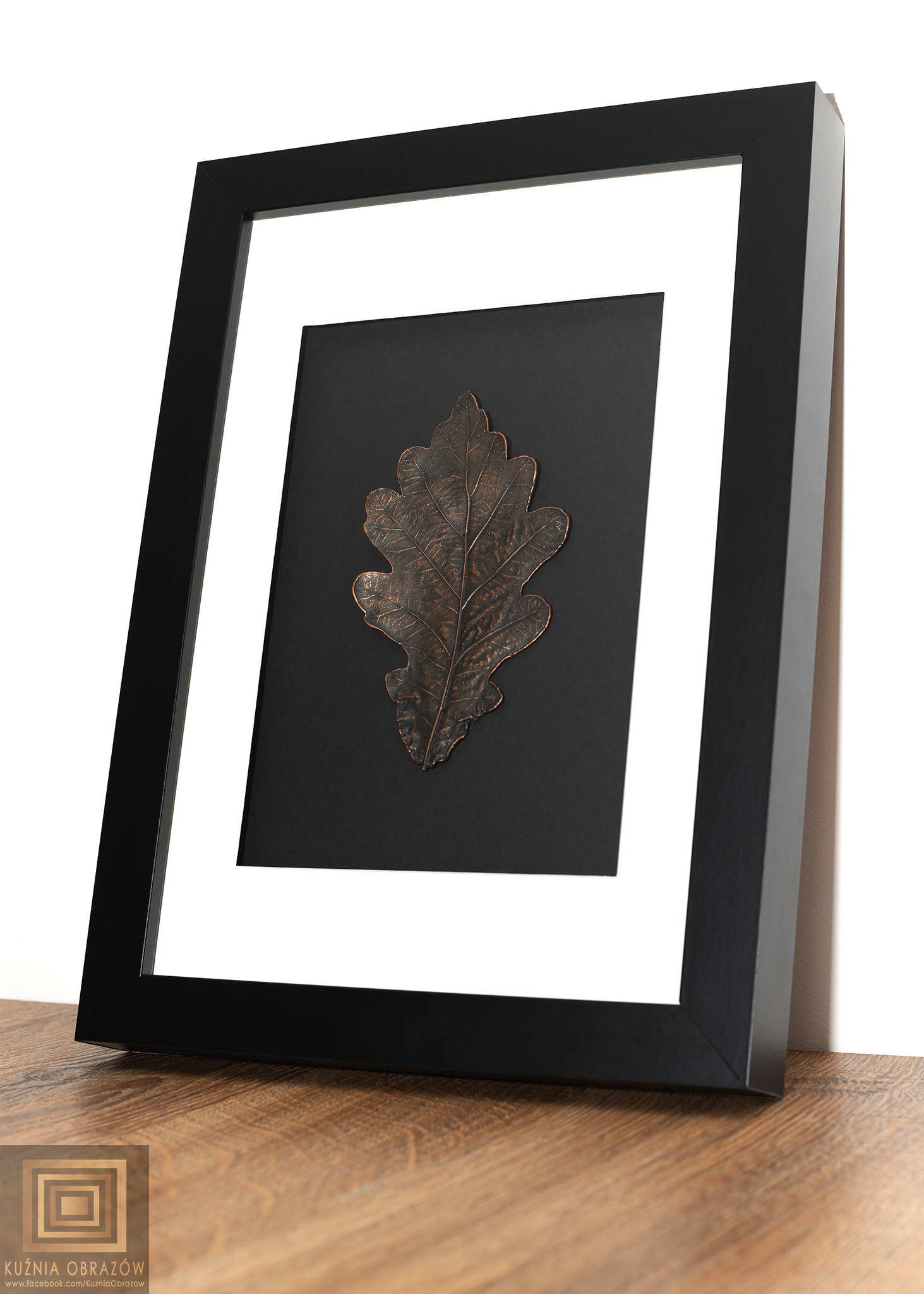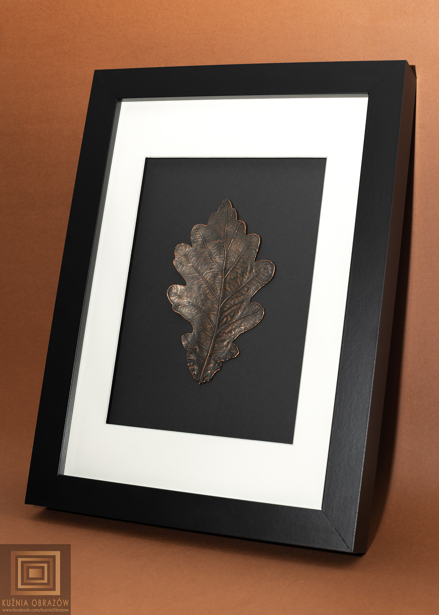 Miedziany liść dębu w nowoczesnej oprawie.